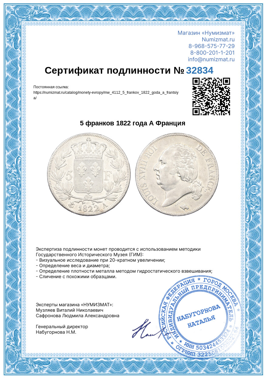 Монета 5 франков 1822 года А Франция [Артикул: MW-4112]