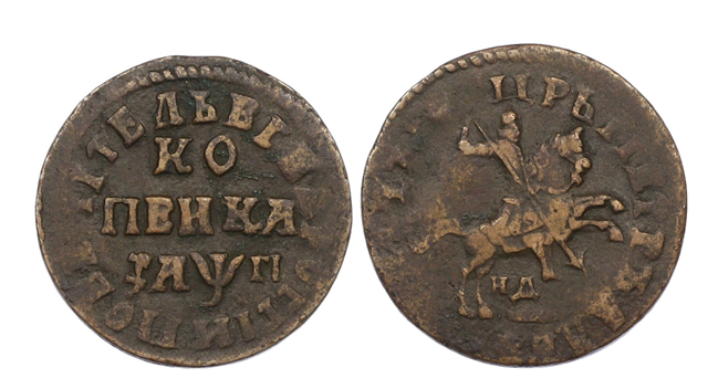 Московская копейка Петра I 1713 года. Набережный монетный двор