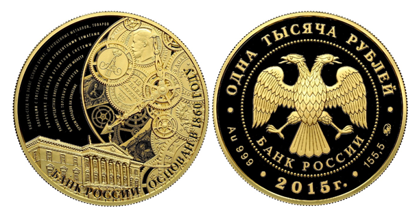 Золотая монета с номиналом в одну тысячу рублей, посвященная 155-летию Банка России. Отчеканена в 2015 году на ММД.