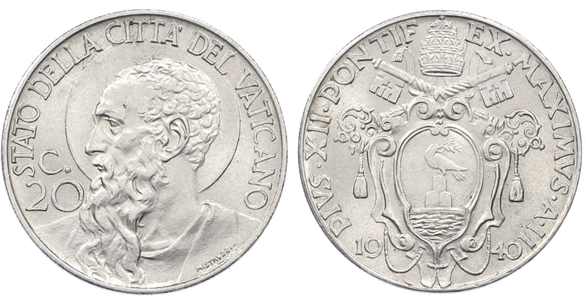 Монета Ватикана 20 чентезимо 1940 года. Чеканились из стали.