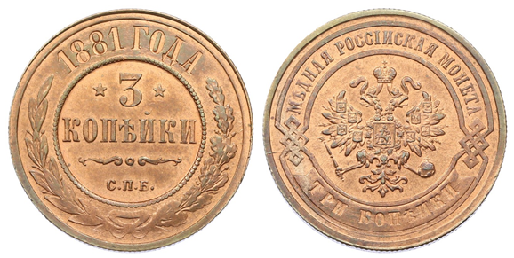 Медная монета Российской империи, 3 копейки 1881 года СПБ
